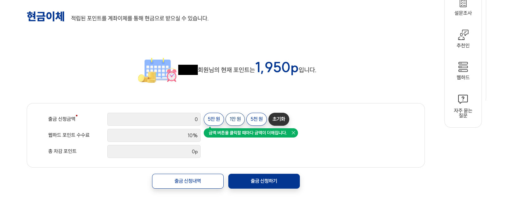 - 현금 출금: 적립된 포인트를 현금으로 출금하여 자유롭게 사용할 수 있습니다.